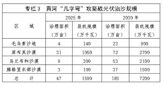 (二)推进以林光牧光相结合的光伏治沙模式,助力打赢黄河“几字弯”攻坚战。在毛乌素沙地、库布其沙漠、乌兰布和沙漠、腾格里东部沙漠及周边,采用适应干旱、半干旱环境的抗沙尘、高效率光伏技术路线,统筹光伏开发、生态旅游、工业园区等分区域用途管理,对较集中区块进行光伏规模化开发,在沙漠、沙地边缘居住区进行光伏分布式开发。到2025年建成光伏装机1590万千瓦,到2030年达到7200万千瓦。推进种植耐旱、固土的多年生草本植物,在有条件的地区探索种养结合模式,实现林光互补和牧光互补。到2025年完成光伏治沙面积47万亩,到2030年完成光伏治沙面积约185万亩。